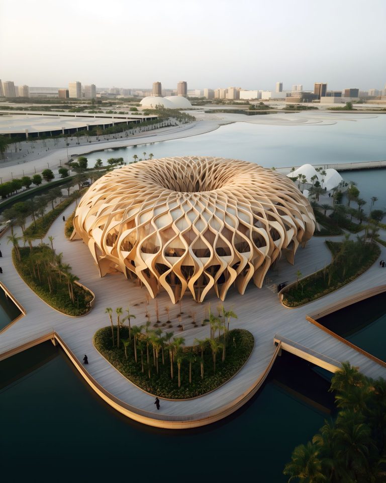 This building is designed in the shape of a large, semi-spherical dome, half-submerged and half-floating on the water’s surface. This form creates a sense of balance, symmetry, and integration with the environment. The circular structure is a symbol of rotation, cycles, and harmony with nature.