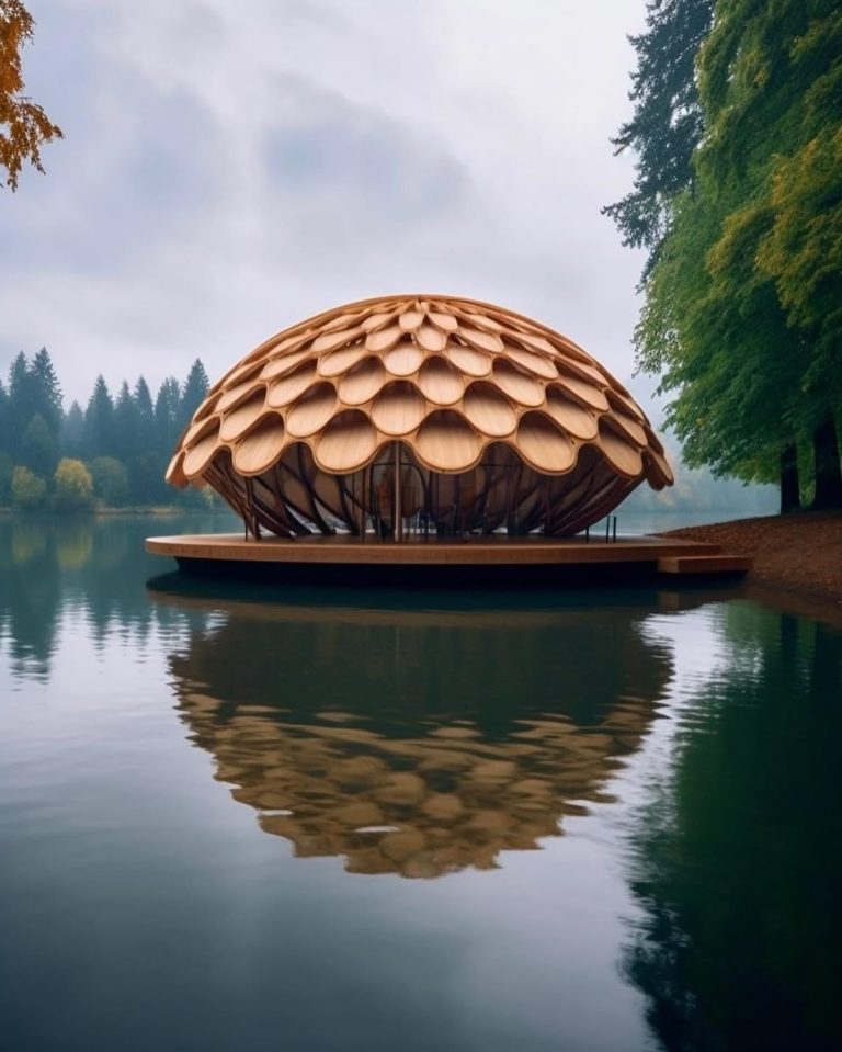 This building is a symbol of sustainable architecture in harmony with nature. Through the use of natural materials, its wave-like form, and its position on the water, this design demonstrates that buildings can draw inspiration from nature and coexist with it, rather than destroy it.