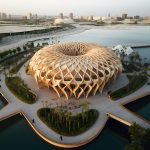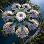 This building is designed in the shape of a large, semi-spherical dome, half-submerged and half-floating on the water’s surface. This form creates a sense of balance, symmetry, and integration with the environment. The circular structure is a symbol of rotation, cycles, and harmony with nature.