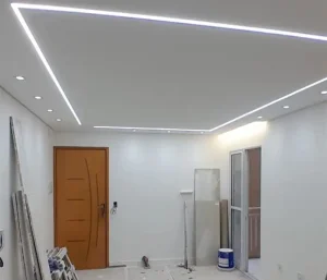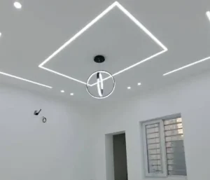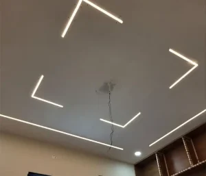 ۱. سقفهای خطی با طراحی هندسی و مدرن در این پروژه، سقفها با استفاده از لاینهای نوری خطی و الگوهای
